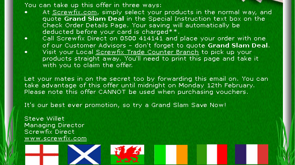 If you have any enquiry regarding this email or any other customer service related enquiry please click here. * Offer valid until midnight Monday 12th February 2007. Cannot be redeemed in conjunction with any other offer/promotion/incentive. Cannot be redeemed when purchasing Screwfix vouchers. Cash redemption value 0.0001p. ** This saving will not appear on your order confirmation email and your checkout total. *** Kitchen price based on 8 unit comparison with an 8 minimum order quantity. 'Was' price relates to Catalogue 84 (available from 23rd October 2006 to 4th January 2007). Contact Details: Screwfix Direct, Trade House, Mead Avenue, Yeovil, BA22 8RT. |